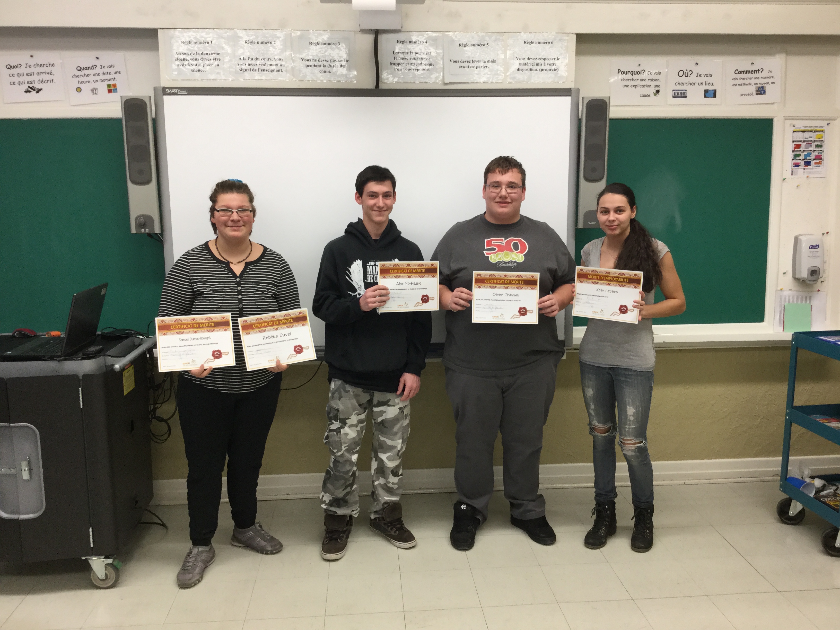 Bravo aux élèves méritants! En CFER-1: Alex St-Hilaire En CFER-2: Rébéka Duval En CFER-3: Samuel Dumas-Bourget En CFER-FMS: Olivier Thibault Méritas entreprise: Kelly Leclerc
